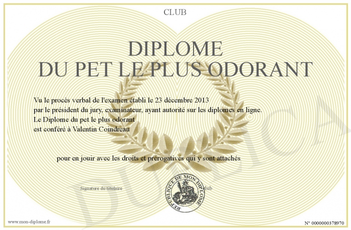 Envoyez par email votre Diplôme du pet le plus odorant personalisé