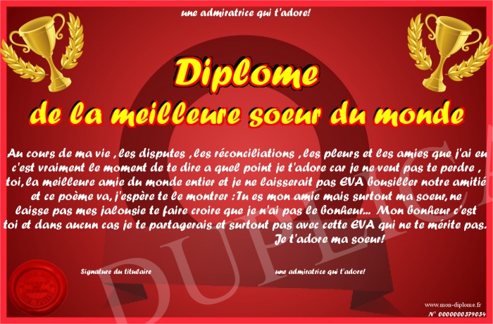 Envoyez par email votre Diplôme de la meilleure soeur du monde personalisé