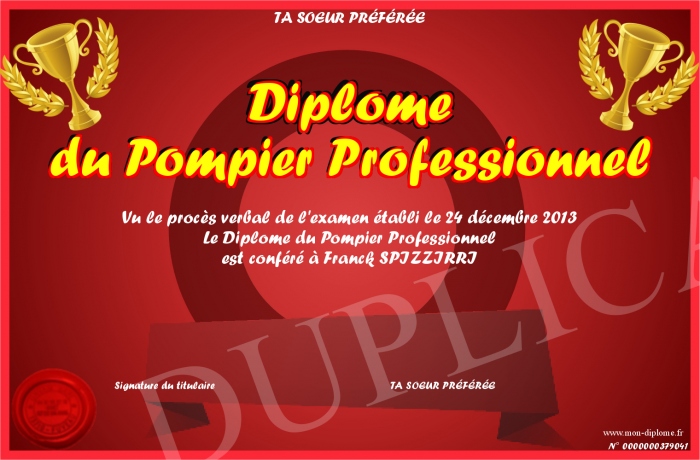Envoyez par email votre Diplôme du Pompier Professionnel personalisé