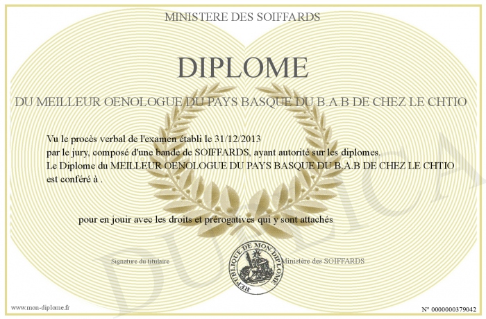 Envoyez par email votre Diplôme du MEILLEUR OENOLOGUE DU PAYS BASQUE DU B.A.B DE CHEZ LE CHTIO personalisé