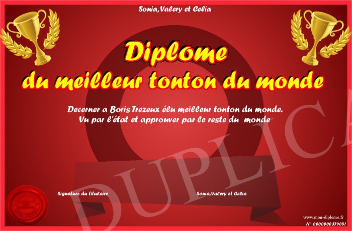 Envoyez par email votre Diplome du meilleur tonton du monde personalisé
