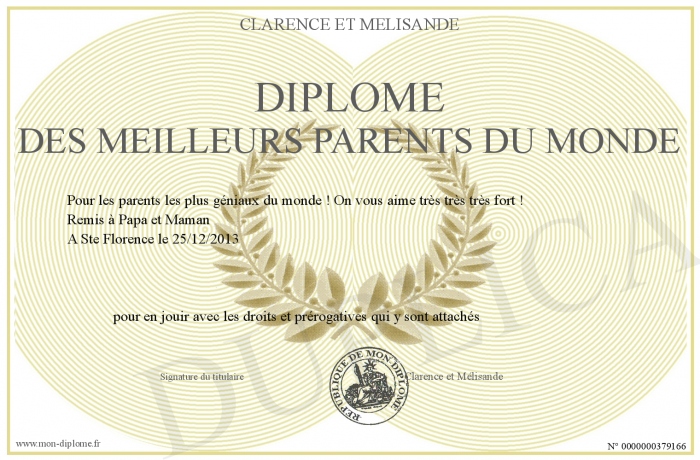 Envoyez par email votre Diplome des meilleurs parents du monde personalisé