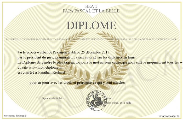 Envoyez par email votre Diplôme du gendre le plus taquin, toujours le mot au sens caché,qui nous enlève inopinément tous les weekend notre fille Anne et avec le sour ire en coin. personalisé
