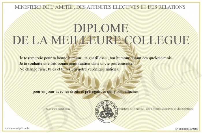 Envoyez par email votre Diplôme de la meilleure collègue personalisé