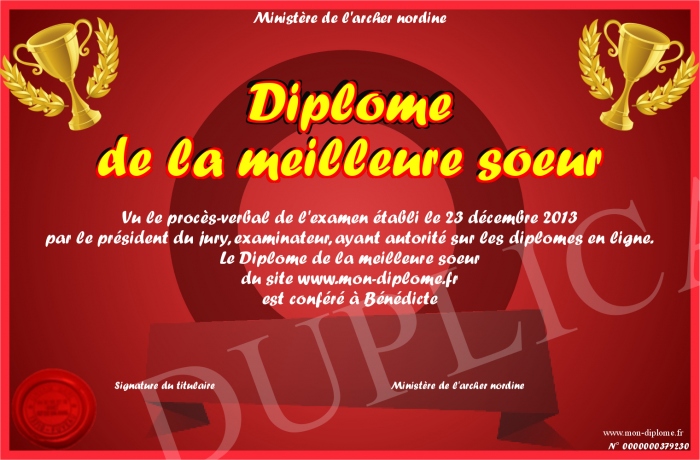 Envoyez par email votre Diplôme de la meilleure soeur personalisé