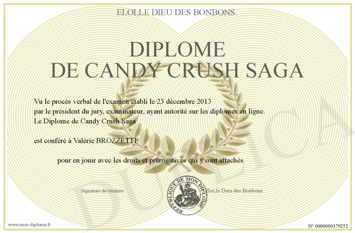 Envoyez par email votre Diplôme de Candy Crush Saga personalisé