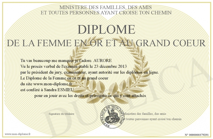 Envoyez par email votre Diplôme de la Femme en or et au grand coeur personalisé