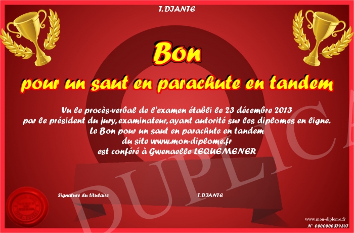 Envoyez par email votre Bon pour un saut en parachute en tandem personalisé