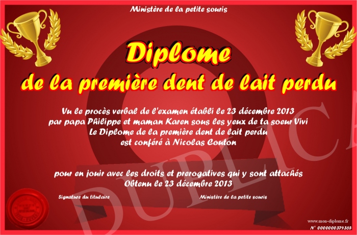 Envoyez par email votre Diplôme de la première dent de lait perdu personalisé
