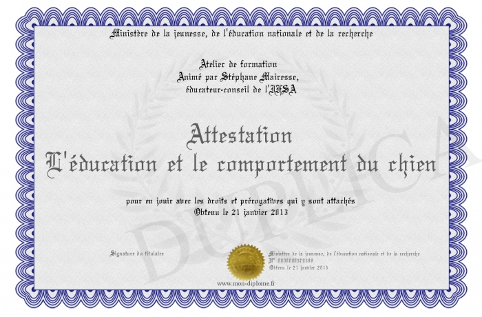 Envoyez par email votre Attestation L'éducation et le comportement du chien personalisé