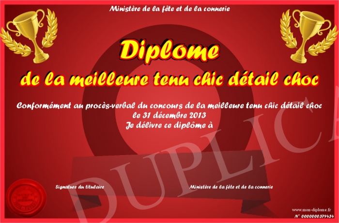 Envoyez par email votre Diplôme de la meilleure tenu chic détail choc personalisé