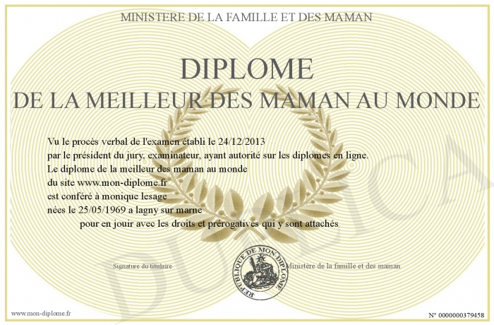 Envoyez par email votre Diplôme de la meilleur des maman au monde personalisé