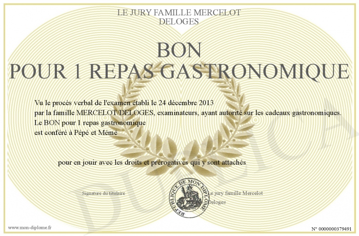 Envoyez par email votre BON pour 1 repas gastronomique personalisé
