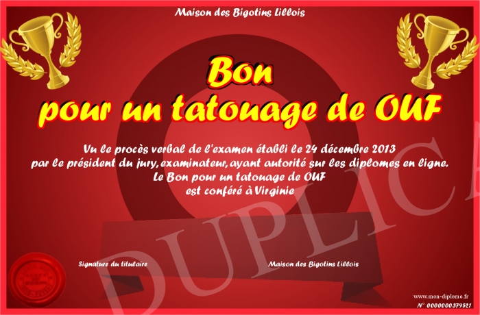 Envoyez par email votre Bon pour un tatouage de OUF personalisé