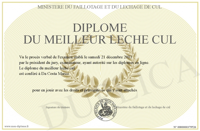 Envoyez par email votre Diplôme du Meilleur Leche Cul personalisé