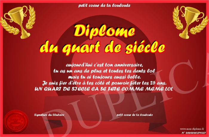 Envoyez par email votre Diplôme du quart de siécle personalisé