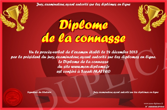 Envoyez par email votre Diplôme de la connasse personalisé