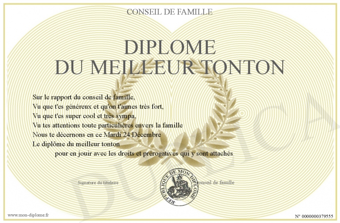 Envoyez par email votre Diplôme du meilleur tonton personalisé