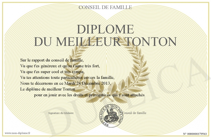 Envoyez par email votre Diplôme du meilleur Tonton personalisé