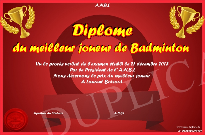 Envoyez par email votre Diplôme du meilleur joueur de Badminton personalisé