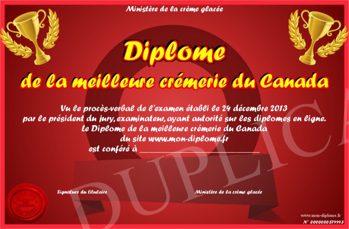 Envoyez par email votre Diplôme de la meilleure crémerie du Canada personalisé