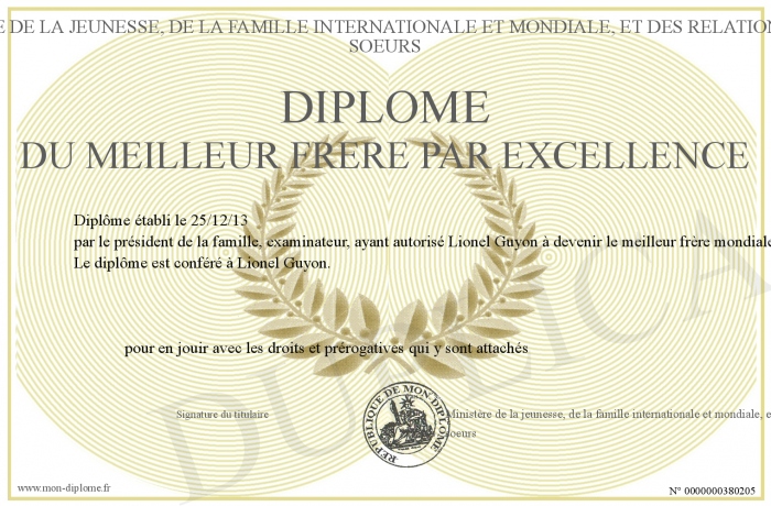 Envoyez par email votre Diplôme du meilleur frère par excellence personalisé