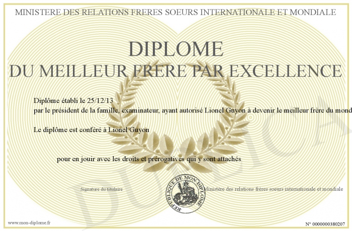 Envoyez par email votre Diplôme du meilleur frère par excellence personalisé