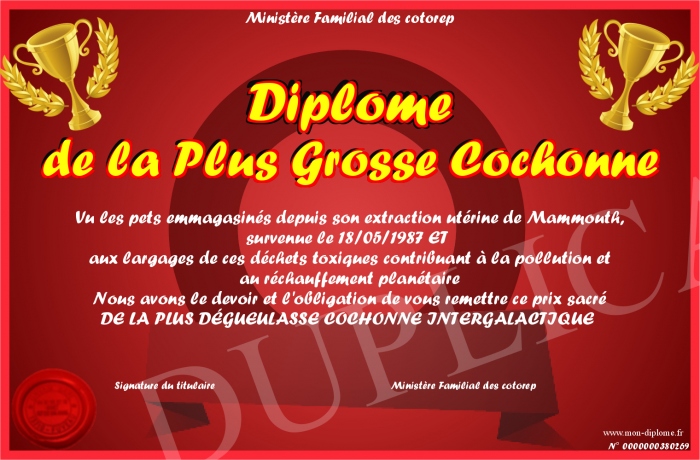 Envoyez par email votre Diplôme de la Plus Grosse Cochonne personalisé