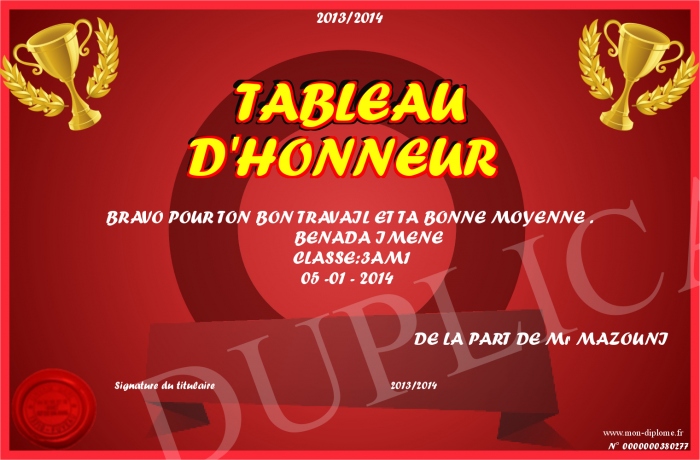 Envoyez par email votre TABLEAU D'HONNEUR personalisé