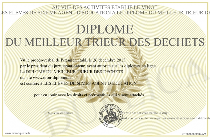 envoyé par le Au vue des activités établie le vingt-neuf mai deux mille douze par les élèves de sixème agent d'éducation A Le diplome du meilleur trieur des déchets est conféré à l'élève !