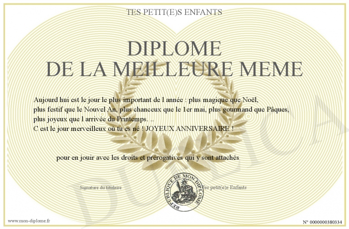 Envoyez par email votre Diplôme de la meilleure Mémé personalisé