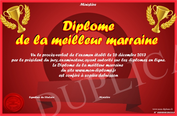 Envoyez par email votre Diplôme de la meilleur marraine personalisé