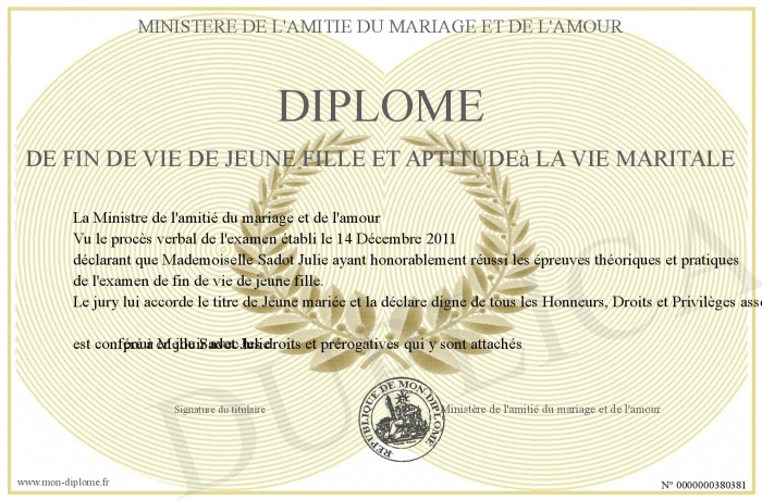 Envoyez par email votre Diplôme de fin de vie de jeune fille et aptitudeà la vie maritale personalisé
