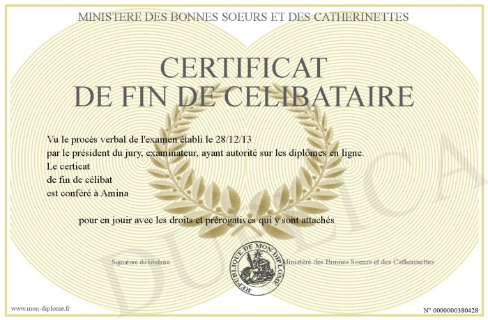 Envoyez par email votre Certificat de fin de célibataire personalisé