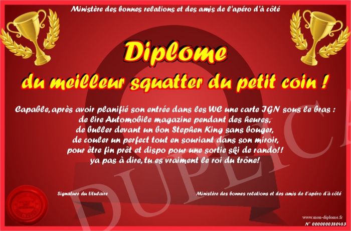 Envoyez par email votre Diplôme du meilleur squatter du petit coin ! personalisé