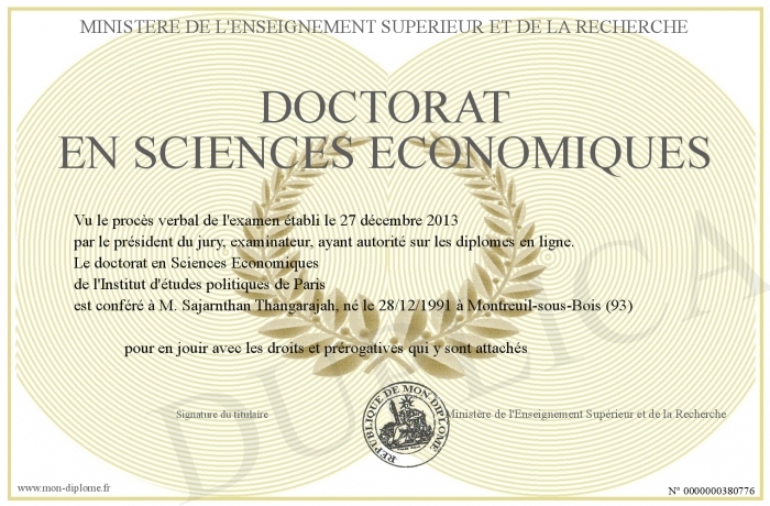 Envoyez par email votre doctorat en Sciences Economiques personalisé