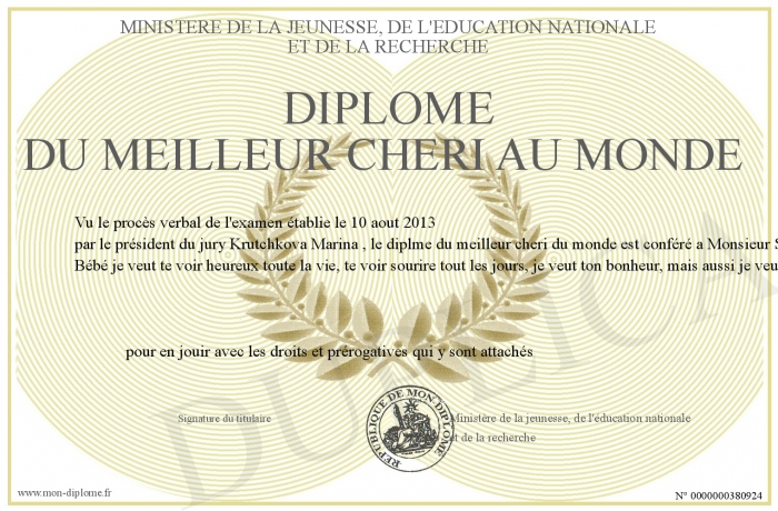 Envoyez par email votre Diplome du meilleur cheri au monde personalisé