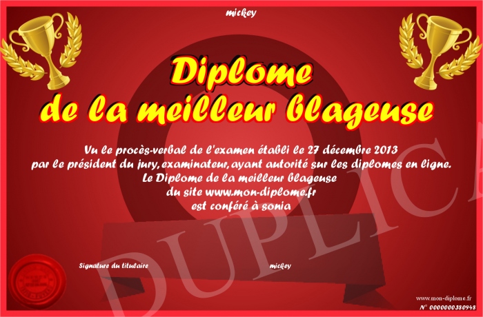 Envoyez par email votre Diplôme de la meilleur blageuse personalisé