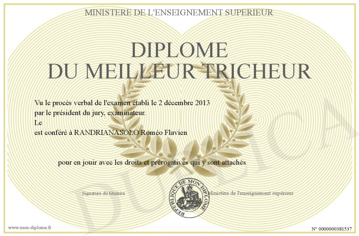 Envoyez par email votre Diplôme du meilleur tricheur personalisé