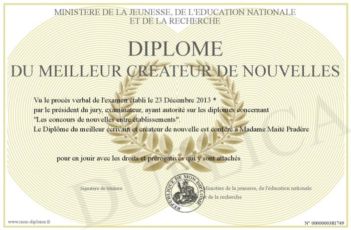 Envoyez par email votre Diplôme du meilleur créateur de nouvelles personalisé