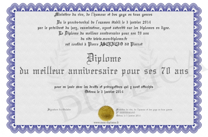 Envoyez par email votre Diplôme du meilleur anniversaire pour ses 70 ans personalisé