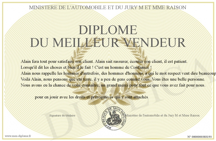Envoyez par email votre Diplôme du meilleur vendeur personalisé