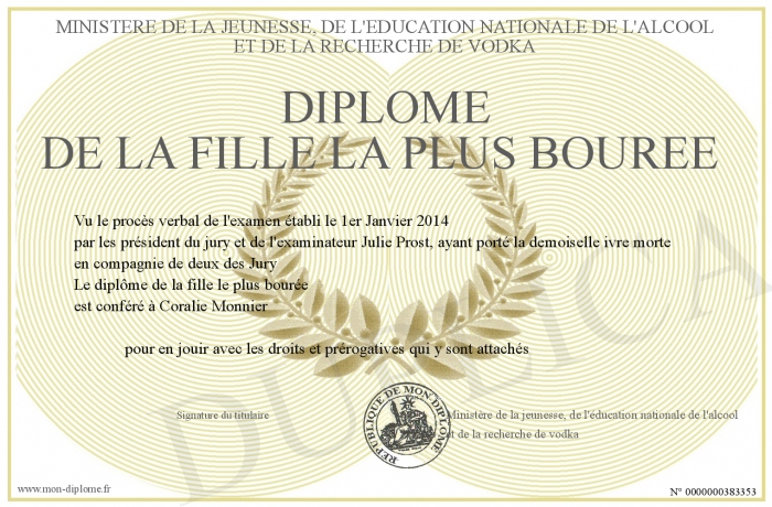 Envoyez par email votre Diplôme de la fille la plus bourée personalisé