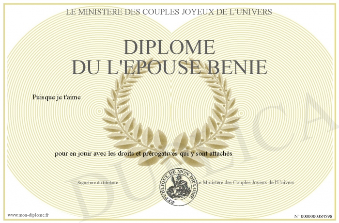 Envoyez par email votre Diplôme du l'épouse bénie personalisé
