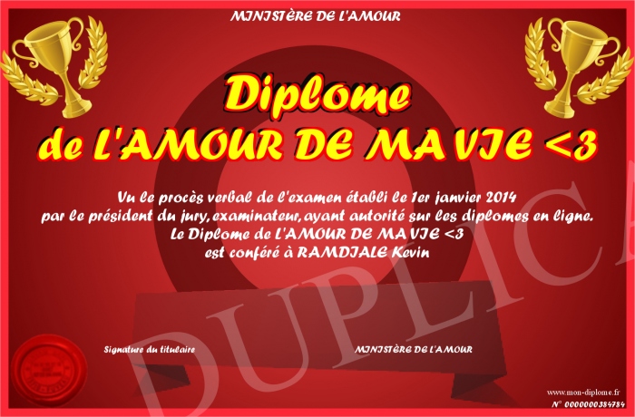Envoyez par email votre Diplôme de L'AMOUR DE MA VIE -3 personalisé