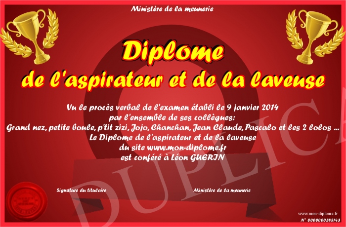Envoyez par email votre Diplôme de l'aspirateur et de la laveuse personalisé