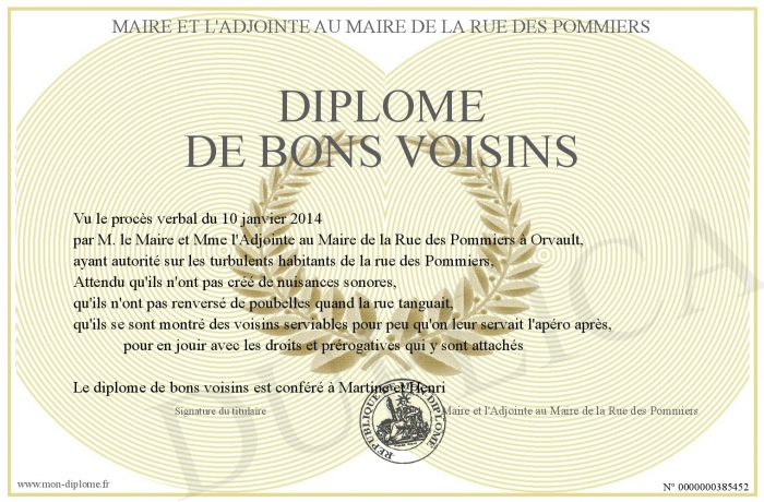 Envoyez par email votre diplome de bons voisins personalisé