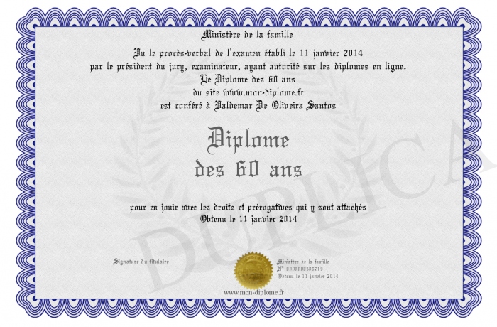 Envoyez par email votre Diplôme des 60 ans personalisé