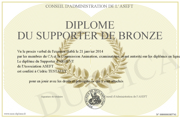Envoyez par email votre Diplôme du Supporter de BRONZE personalisé