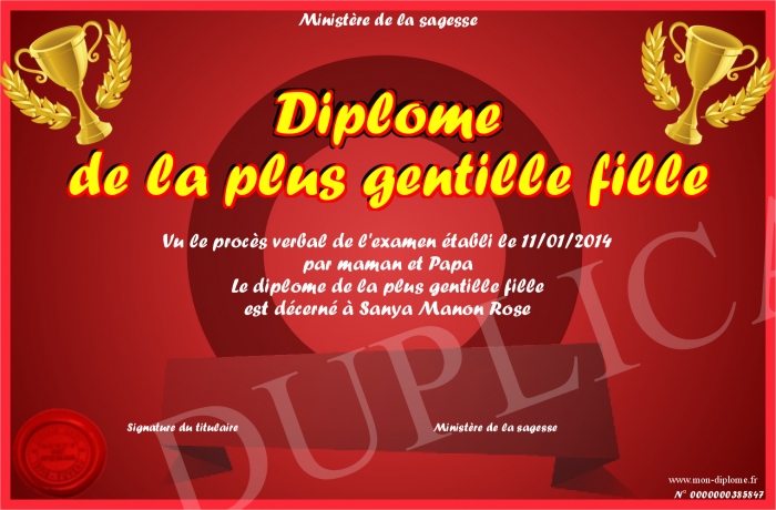 Envoyez par email votre Diplôme de la plus gentille fille personalisé